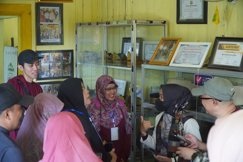 Sisi budaya Pekanbaru semakin terasa saat rombongan mengunjungi Rumah Tenun Senapelan. Para penulis disambut hangat oleh pengrajin lokal dan berkesempatan melihat langsung ketelitian proses pembuatan kain songket khas Melayu Riau. Antusiasme peserta memuncak saat mereka mengamati jemari para pengrajin yang lincah menenun helai demi helai benang menjadi wastra yang indah.
